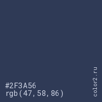 Цвет #2F3A56 в цветовой модели RGB обозначается тремя октетами (47, 58, 86) в десятичном формате и #2F3A56 в шестнадцатиричном (hex) формате, которые являются интенсивностью красного 47 (hex 2F), интенсивность зелёного 58 (hex 3A) и интенсивность синего 86 (hex 56).