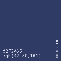 Цвет #2F3A65 в цветовой модели RGB обозначается тремя октетами (47, 58, 101) в десятичном формате и #2F3A65 в шестнадцатиричном (hex) формате, которые являются интенсивностью красного 47 (hex 2F), интенсивность зелёного 58 (hex 3A) и интенсивность синего 101 (hex 65).