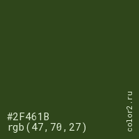 Цвет #2F461B в цветовой модели RGB обозначается тремя октетами (47, 70, 27) в десятичном формате и #2F461B в шестнадцатиричном (hex) формате, которые являются интенсивностью красного 47 (hex 2F), интенсивность зелёного 70 (hex 46) и интенсивность синего 27 (hex 1B).
