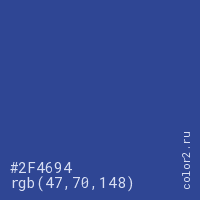Цвет #2F4694 в цветовой модели RGB обозначается тремя октетами (47, 70, 148) в десятичном формате и #2F4694 в шестнадцатиричном (hex) формате, которые являются интенсивностью красного 47 (hex 2F), интенсивность зелёного 70 (hex 46) и интенсивность синего 148 (hex 94).