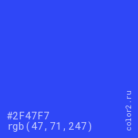 Цвет #2F47F7 в цветовой модели RGB обозначается тремя октетами (47, 71, 247) в десятичном формате и #2F47F7 в шестнадцатиричном (hex) формате, которые являются интенсивностью красного 47 (hex 2F), интенсивность зелёного 71 (hex 47) и интенсивность синего 247 (hex F7).