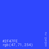 Цвет #2F47FE в цветовой модели RGB обозначается тремя октетами (47, 71, 254) в десятичном формате и #2F47FE в шестнадцатиричном (hex) формате, которые являются интенсивностью красного 47 (hex 2F), интенсивность зелёного 71 (hex 47) и интенсивность синего 254 (hex FE).