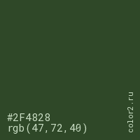 Цвет #2F4828 в цветовой модели RGB обозначается тремя октетами (47, 72, 40) в десятичном формате и #2F4828 в шестнадцатиричном (hex) формате, которые являются интенсивностью красного 47 (hex 2F), интенсивность зелёного 72 (hex 48) и интенсивность синего 40 (hex 28).