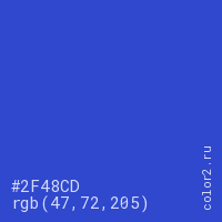 Цвет #2F48CD в цветовой модели RGB обозначается тремя октетами (47, 72, 205) в десятичном формате и #2F48CD в шестнадцатиричном (hex) формате, которые являются интенсивностью красного 47 (hex 2F), интенсивность зелёного 72 (hex 48) и интенсивность синего 205 (hex CD).