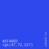 Цвет #2F48ED в цветовой модели RGB обозначается тремя октетами (47, 72, 237) в десятичном формате и #2F48ED в шестнадцатиричном (hex) формате, которые являются интенсивностью красного 47 (hex 2F), интенсивность зелёного 72 (hex 48) и интенсивность синего 237 (hex ED).