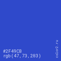 Цвет #2F49CB в цветовой модели RGB обозначается тремя октетами (47, 73, 203) в десятичном формате и #2F49CB в шестнадцатиричном (hex) формате, которые являются интенсивностью красного 47 (hex 2F), интенсивность зелёного 73 (hex 49) и интенсивность синего 203 (hex CB).