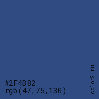 Цвет #2F4B82 в цветовой модели RGB обозначается тремя октетами (47, 75, 130) в десятичном формате и #2F4B82 в шестнадцатиричном (hex) формате, которые являются интенсивностью красного 47 (hex 2F), интенсивность зелёного 75 (hex 4B) и интенсивность синего 130 (hex 82).