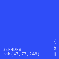 Цвет #2F4DF8 в цветовой модели RGB обозначается тремя октетами (47, 77, 248) в десятичном формате и #2F4DF8 в шестнадцатиричном (hex) формате, которые являются интенсивностью красного 47 (hex 2F), интенсивность зелёного 77 (hex 4D) и интенсивность синего 248 (hex F8).