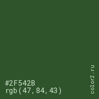 Цвет #2F542B в цветовой модели RGB обозначается тремя октетами (47, 84, 43) в десятичном формате и #2F542B в шестнадцатиричном (hex) формате, которые являются интенсивностью красного 47 (hex 2F), интенсивность зелёного 84 (hex 54) и интенсивность синего 43 (hex 2B).