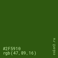 Цвет #2F5910 в цветовой модели RGB обозначается тремя октетами (47, 89, 16) в десятичном формате и #2F5910 в шестнадцатиричном (hex) формате, которые являются интенсивностью красного 47 (hex 2F), интенсивность зелёного 89 (hex 59) и интенсивность синего 16 (hex 10).
