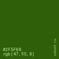 Цвет #2F5F08 в цветовой модели RGB обозначается тремя октетами (47, 95, 8) в десятичном формате и #2F5F08 в шестнадцатиричном (hex) формате, которые являются интенсивностью красного 47 (hex 2F), интенсивность зелёного 95 (hex 5F) и интенсивность синего 8 (hex 08).