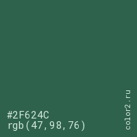 Цвет #2F624C в цветовой модели RGB обозначается тремя октетами (47, 98, 76) в десятичном формате и #2F624C в шестнадцатиричном (hex) формате, которые являются интенсивностью красного 47 (hex 2F), интенсивность зелёного 98 (hex 62) и интенсивность синего 76 (hex 4C).