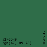 Цвет #2F6D49 в цветовой модели RGB обозначается тремя октетами (47, 109, 73) в десятичном формате и #2F6D49 в шестнадцатиричном (hex) формате, которые являются интенсивностью красного 47 (hex 2F), интенсивность зелёного 109 (hex 6D) и интенсивность синего 73 (hex 49).
