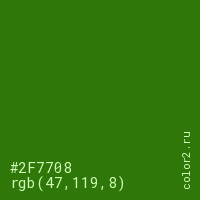 Цвет #2F7708 в цветовой модели RGB обозначается тремя октетами (47, 119, 8) в десятичном формате и #2F7708 в шестнадцатиричном (hex) формате, которые являются интенсивностью красного 47 (hex 2F), интенсивность зелёного 119 (hex 77) и интенсивность синего 8 (hex 08).