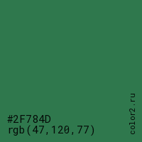 Цвет #2F784D в цветовой модели RGB обозначается тремя октетами (47, 120, 77) в десятичном формате и #2F784D в шестнадцатиричном (hex) формате, которые являются интенсивностью красного 47 (hex 2F), интенсивность зелёного 120 (hex 78) и интенсивность синего 77 (hex 4D).