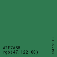 Цвет #2F7A50 в цветовой модели RGB обозначается тремя октетами (47, 122, 80) в десятичном формате и #2F7A50 в шестнадцатиричном (hex) формате, которые являются интенсивностью красного 47 (hex 2F), интенсивность зелёного 122 (hex 7A) и интенсивность синего 80 (hex 50).