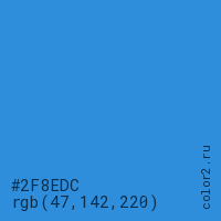 Цвет #2F8EDC в цветовой модели RGB обозначается тремя октетами (47, 142, 220) в десятичном формате и #2F8EDC в шестнадцатиричном (hex) формате, которые являются интенсивностью красного 47 (hex 2F), интенсивность зелёного 142 (hex 8E) и интенсивность синего 220 (hex DC).