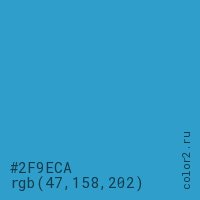 Цвет #2F9ECA в цветовой модели RGB обозначается тремя октетами (47, 158, 202) в десятичном формате и #2F9ECA в шестнадцатиричном (hex) формате, которые являются интенсивностью красного 47 (hex 2F), интенсивность зелёного 158 (hex 9E) и интенсивность синего 202 (hex CA).