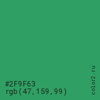 Цвет #2F9F63 в цветовой модели RGB обозначается тремя октетами (47, 159, 99) в десятичном формате и #2F9F63 в шестнадцатиричном (hex) формате, которые являются интенсивностью красного 47 (hex 2F), интенсивность зелёного 159 (hex 9F) и интенсивность синего 99 (hex 63).