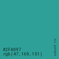 Цвет #2FA097 в цветовой модели RGB обозначается тремя октетами (47, 160, 151) в десятичном формате и #2FA097 в шестнадцатиричном (hex) формате, которые являются интенсивностью красного 47 (hex 2F), интенсивность зелёного 160 (hex A0) и интенсивность синего 151 (hex 97).