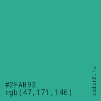 Цвет #2FAB92 в цветовой модели RGB обозначается тремя октетами (47, 171, 146) в десятичном формате и #2FAB92 в шестнадцатиричном (hex) формате, которые являются интенсивностью красного 47 (hex 2F), интенсивность зелёного 171 (hex AB) и интенсивность синего 146 (hex 92).