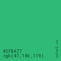 Цвет #2FBA77 в цветовой модели RGB обозначается тремя октетами (47, 186, 119) в десятичном формате и #2FBA77 в шестнадцатиричном (hex) формате, которые являются интенсивностью красного 47 (hex 2F), интенсивность зелёного 186 (hex BA) и интенсивность синего 119 (hex 77).