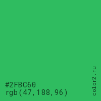 Цвет #2FBC60 в цветовой модели RGB обозначается тремя октетами (47, 188, 96) в десятичном формате и #2FBC60 в шестнадцатиричном (hex) формате, которые являются интенсивностью красного 47 (hex 2F), интенсивность зелёного 188 (hex BC) и интенсивность синего 96 (hex 60).