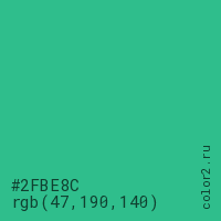 Цвет #2FBE8C в цветовой модели RGB обозначается тремя октетами (47, 190, 140) в десятичном формате и #2FBE8C в шестнадцатиричном (hex) формате, которые являются интенсивностью красного 47 (hex 2F), интенсивность зелёного 190 (hex BE) и интенсивность синего 140 (hex 8C).