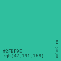 Цвет #2FBF9E в цветовой модели RGB обозначается тремя октетами (47, 191, 158) в десятичном формате и #2FBF9E в шестнадцатиричном (hex) формате, которые являются интенсивностью красного 47 (hex 2F), интенсивность зелёного 191 (hex BF) и интенсивность синего 158 (hex 9E).