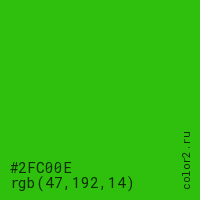 Цвет #2FC00E в цветовой модели RGB обозначается тремя октетами (47, 192, 14) в десятичном формате и #2FC00E в шестнадцатиричном (hex) формате, которые являются интенсивностью красного 47 (hex 2F), интенсивность зелёного 192 (hex C0) и интенсивность синего 14 (hex 0E).