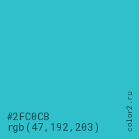 Цвет #2FC0CB в цветовой модели RGB обозначается тремя октетами (47, 192, 203) в десятичном формате и #2FC0CB в шестнадцатиричном (hex) формате, которые являются интенсивностью красного 47 (hex 2F), интенсивность зелёного 192 (hex C0) и интенсивность синего 203 (hex CB).
