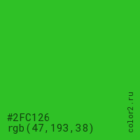 Цвет #2FC126 в цветовой модели RGB обозначается тремя октетами (47, 193, 38) в десятичном формате и #2FC126 в шестнадцатиричном (hex) формате, которые являются интенсивностью красного 47 (hex 2F), интенсивность зелёного 193 (hex C1) и интенсивность синего 38 (hex 26).