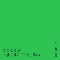 Цвет #2FC354 в цветовой модели RGB обозначается тремя октетами (47, 195, 84) в десятичном формате и #2FC354 в шестнадцатиричном (hex) формате, которые являются интенсивностью красного 47 (hex 2F), интенсивность зелёного 195 (hex C3) и интенсивность синего 84 (hex 54).