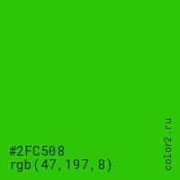 Цвет #2FC508 в цветовой модели RGB обозначается тремя октетами (47, 197, 8) в десятичном формате и #2FC508 в шестнадцатиричном (hex) формате, которые являются интенсивностью красного 47 (hex 2F), интенсивность зелёного 197 (hex C5) и интенсивность синего 8 (hex 08).
