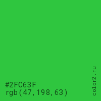 Цвет #2FC63F в цветовой модели RGB обозначается тремя октетами (47, 198, 63) в десятичном формате и #2FC63F в шестнадцатиричном (hex) формате, которые являются интенсивностью красного 47 (hex 2F), интенсивность зелёного 198 (hex C6) и интенсивность синего 63 (hex 3F).