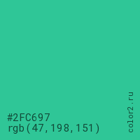 Цвет #2FC697 в цветовой модели RGB обозначается тремя октетами (47, 198, 151) в десятичном формате и #2FC697 в шестнадцатиричном (hex) формате, которые являются интенсивностью красного 47 (hex 2F), интенсивность зелёного 198 (hex C6) и интенсивность синего 151 (hex 97).