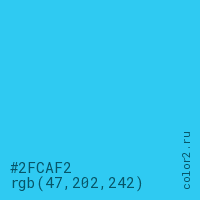 Цвет #2FCAF2 в цветовой модели RGB обозначается тремя октетами (47, 202, 242) в десятичном формате и #2FCAF2 в шестнадцатиричном (hex) формате, которые являются интенсивностью красного 47 (hex 2F), интенсивность зелёного 202 (hex CA) и интенсивность синего 242 (hex F2).