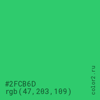 Цвет #2FCB6D в цветовой модели RGB обозначается тремя октетами (47, 203, 109) в десятичном формате и #2FCB6D в шестнадцатиричном (hex) формате, которые являются интенсивностью красного 47 (hex 2F), интенсивность зелёного 203 (hex CB) и интенсивность синего 109 (hex 6D).