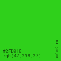 Цвет #2FD01B в цветовой модели RGB обозначается тремя октетами (47, 208, 27) в десятичном формате и #2FD01B в шестнадцатиричном (hex) формате, которые являются интенсивностью красного 47 (hex 2F), интенсивность зелёного 208 (hex D0) и интенсивность синего 27 (hex 1B).