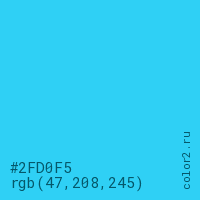 Цвет #2FD0F5 в цветовой модели RGB обозначается тремя октетами (47, 208, 245) в десятичном формате и #2FD0F5 в шестнадцатиричном (hex) формате, которые являются интенсивностью красного 47 (hex 2F), интенсивность зелёного 208 (hex D0) и интенсивность синего 245 (hex F5).