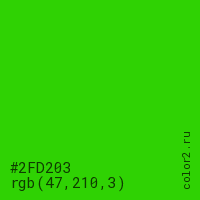 Цвет #2FD203 в цветовой модели RGB обозначается тремя октетами (47, 210, 3) в десятичном формате и #2FD203 в шестнадцатиричном (hex) формате, которые являются интенсивностью красного 47 (hex 2F), интенсивность зелёного 210 (hex D2) и интенсивность синего 3 (hex 03).