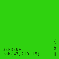 Цвет #2FD20F в цветовой модели RGB обозначается тремя октетами (47, 210, 15) в десятичном формате и #2FD20F в шестнадцатиричном (hex) формате, которые являются интенсивностью красного 47 (hex 2F), интенсивность зелёного 210 (hex D2) и интенсивность синего 15 (hex 0F).