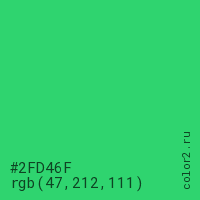 Цвет #2FD46F в цветовой модели RGB обозначается тремя октетами (47, 212, 111) в десятичном формате и #2FD46F в шестнадцатиричном (hex) формате, которые являются интенсивностью красного 47 (hex 2F), интенсивность зелёного 212 (hex D4) и интенсивность синего 111 (hex 6F).
