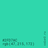 Цвет #2FD7AC в цветовой модели RGB обозначается тремя октетами (47, 215, 172) в десятичном формате и #2FD7AC в шестнадцатиричном (hex) формате, которые являются интенсивностью красного 47 (hex 2F), интенсивность зелёного 215 (hex D7) и интенсивность синего 172 (hex AC).