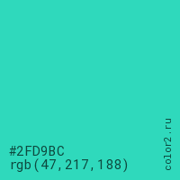 Цвет #2FD9BC в цветовой модели RGB обозначается тремя октетами (47, 217, 188) в десятичном формате и #2FD9BC в шестнадцатиричном (hex) формате, которые являются интенсивностью красного 47 (hex 2F), интенсивность зелёного 217 (hex D9) и интенсивность синего 188 (hex BC).