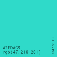 Цвет #2FDAC9 в цветовой модели RGB обозначается тремя октетами (47, 218, 201) в десятичном формате и #2FDAC9 в шестнадцатиричном (hex) формате, которые являются интенсивностью красного 47 (hex 2F), интенсивность зелёного 218 (hex DA) и интенсивность синего 201 (hex C9).