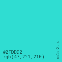 Цвет #2FDDD2 в цветовой модели RGB обозначается тремя октетами (47, 221, 210) в десятичном формате и #2FDDD2 в шестнадцатиричном (hex) формате, которые являются интенсивностью красного 47 (hex 2F), интенсивность зелёного 221 (hex DD) и интенсивность синего 210 (hex D2).