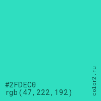 Цвет #2FDEC0 в цветовой модели RGB обозначается тремя октетами (47, 222, 192) в десятичном формате и #2FDEC0 в шестнадцатиричном (hex) формате, которые являются интенсивностью красного 47 (hex 2F), интенсивность зелёного 222 (hex DE) и интенсивность синего 192 (hex C0).