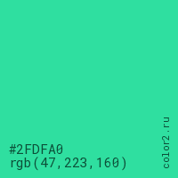 Цвет #2FDFA0 в цветовой модели RGB обозначается тремя октетами (47, 223, 160) в десятичном формате и #2FDFA0 в шестнадцатиричном (hex) формате, которые являются интенсивностью красного 47 (hex 2F), интенсивность зелёного 223 (hex DF) и интенсивность синего 160 (hex A0).
