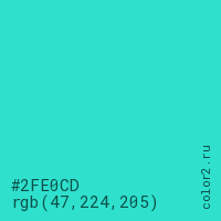 Цвет #2FE0CD в цветовой модели RGB обозначается тремя октетами (47, 224, 205) в десятичном формате и #2FE0CD в шестнадцатиричном (hex) формате, которые являются интенсивностью красного 47 (hex 2F), интенсивность зелёного 224 (hex E0) и интенсивность синего 205 (hex CD).